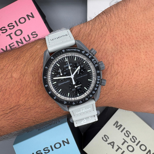 رنگ خاکستری و دودی نماد اولین سیاره ی منظومه ی شمسی عطارد. این ساعت با رنگ خاکستری متالیک یکی از خاص ترین رنگ های این مدل هست . عقربه ثانیه شمار کرنوگراف، عقربه های فرعی و مقیاس سرعت سنج به رنگ سفید هستند. همه شمارهها دارای مارک OMEGA X SWATCH، و همچنین نشان نمادین Speedmaster و لوگوی جدید MoonSwatch هستند.